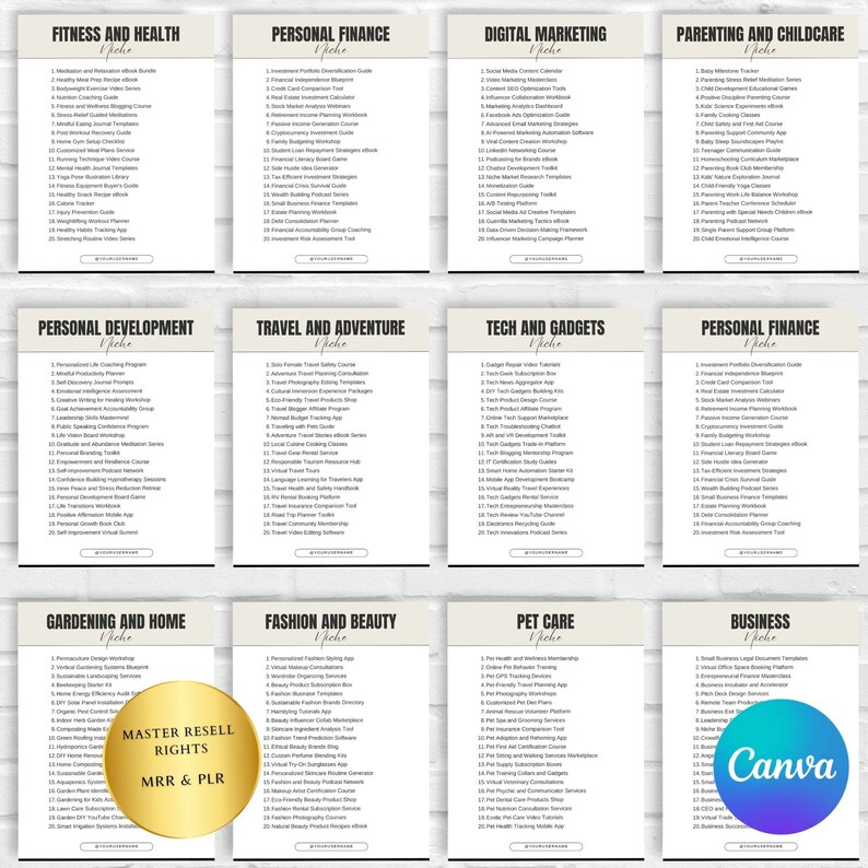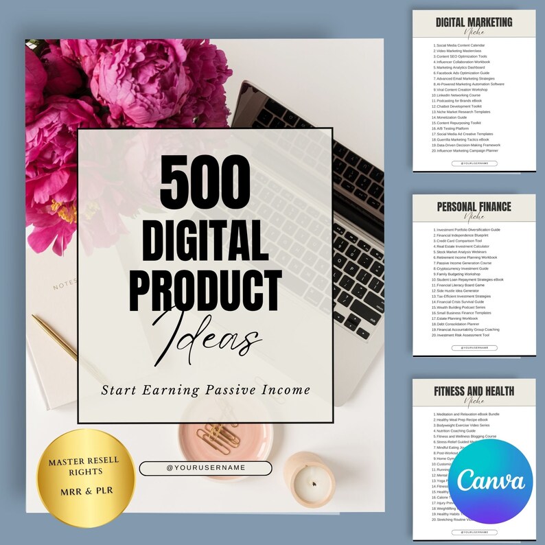 Discover a goldmine of 500 digital product ideas designed for passive income generation, all with master resell rights (MRR) and private label rights (PLR) included. With these “done for you” Canva templates, small business owners can easily create best-selling products to sell on platforms like Etsy. Whether you’re looking to boost your passive income streams or seeking new small business opportunities, this collection of digital downloads covers everything from product bestsellers to innovative small business plans. Say goodbye to brainstorming and hello to profitability with these proven passive income ideas at your fingertips!